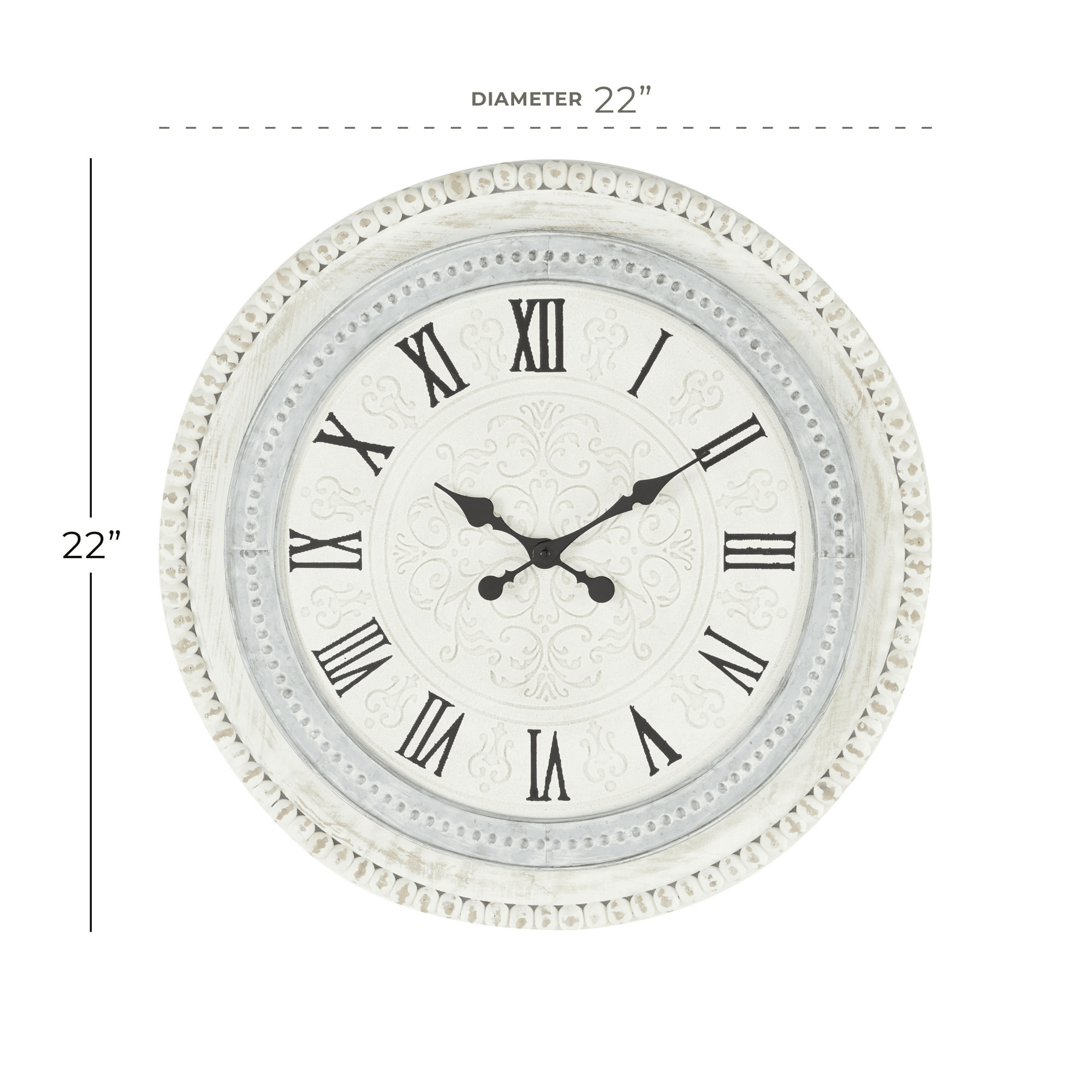 Decmode 22" white wood carved beading wall clock is a unique addition to your stylish home. This round wall clock is best displayed with soft hues themed farmhouse decorations. Requires 1 aa battery. Battery not included. This item ships in 1 carton. This clock features a roman numeral clock face with black hands. The clock mechanism runs silent. This item features a wall clock with beads frame. Can be hung vertically using the d-rings on the back; nails and screws not included. Suitable for indoor use only. This item ships fully assembled in one piece. This is a single white colored oversized wall clock. Farmhouse style.