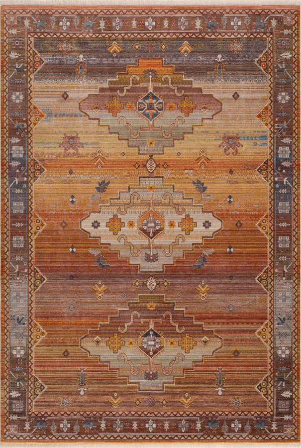 The distressed display of desert hues in brown, yellow, orange, and blue gives this area rug a rustic boho-chic appeal.