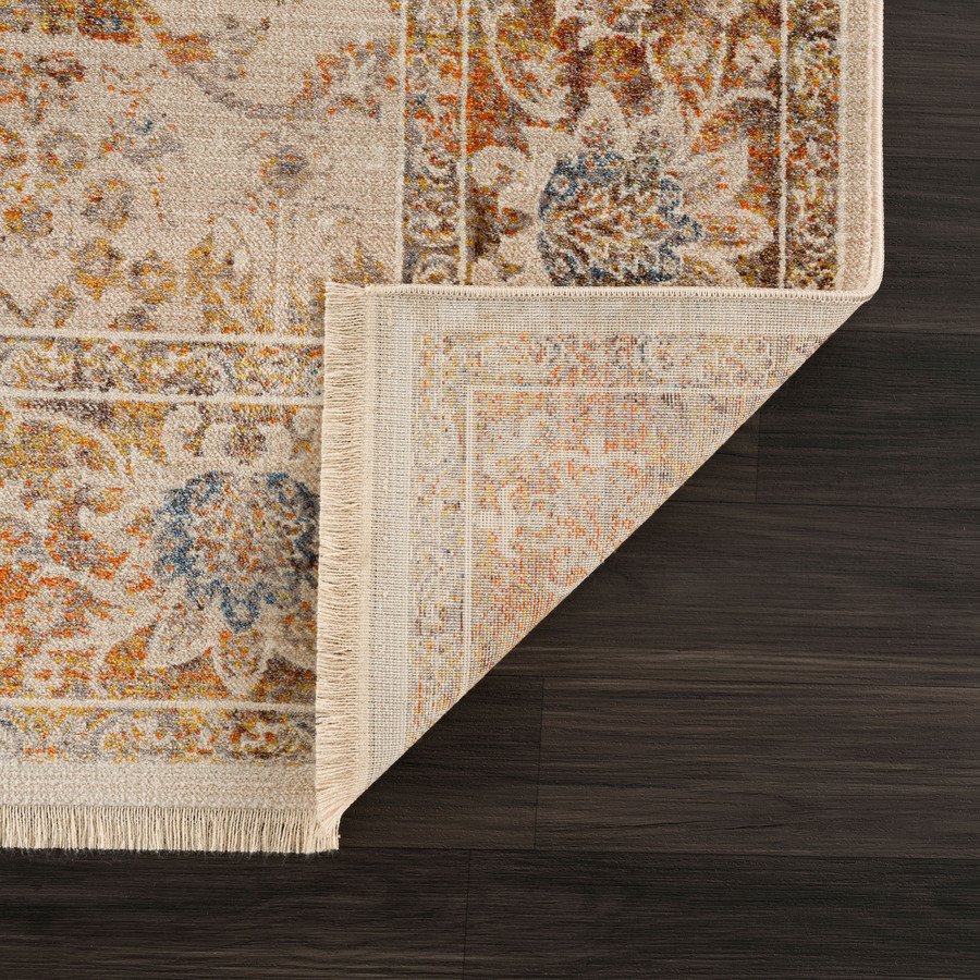 The distressed display of desert hues in brown, yellow, orange, and blue gives this area rug a rustic boho-chic appeal.